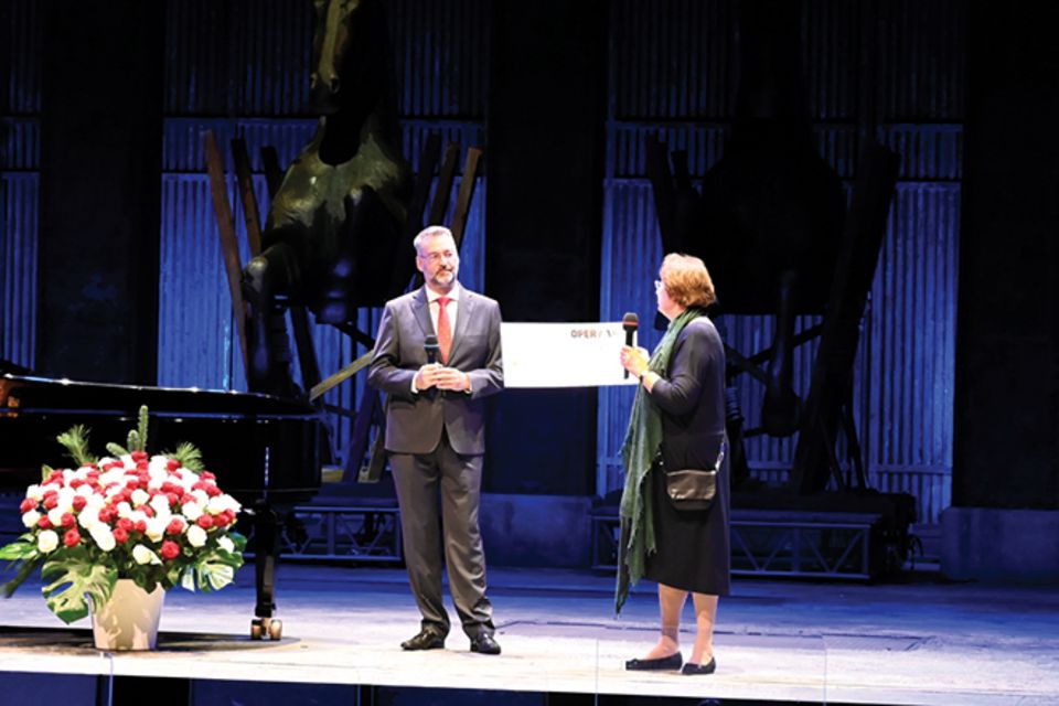 Mit der jährlichen Benefizmatinee unterstützt die Oper Köln seit inzwischen 46 Jahren die Arbeit des Kölner Roten Kreuzes für Menscehn in Not. Gleich zu Beginn der beliebten Musikveranstaltung überreichte Opernintendant Hein Mulders einen symbolischen Scheck über 25.000 Euro an die Vorsitzende des Kölner Roten Kreuzes, Katharina Schulte. In ihrer Begrüßungsrede dankte Schulte allen beteiligten Künstlerinnen und Künstlern sowie den Sponsoren für ihre Unterstützung. Sie betonte, dass durch die Erlöse der Matinee jährlich rund 100 Menschen in Notlagen geholfen werden kann.