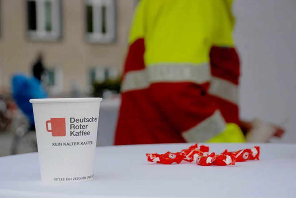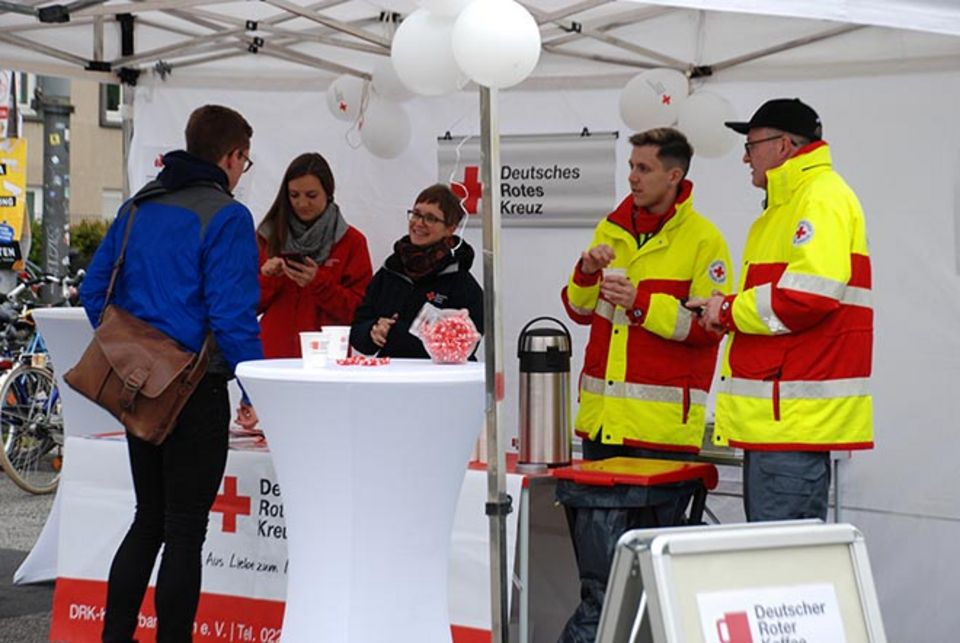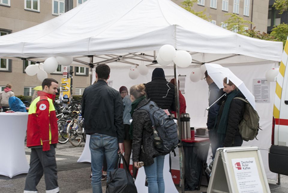 Anlässlich des Weltrotkreuztages am 8. Mai lud das Kölner Rote Kreuz Passanten auf dem Albertus-Magnus-Platz vor dem Uni-Hauptgebäude zum Kaffee ein. Trotz des Schauerwetters gingen über 100 Becher frischgebrühten Kaffees am Aktionsstand über den Tisch. Vor allem Studierende der Universität Köln informierten sich über Engagementmöglichkeiten beim DRK. Helfer und Mitarbeiter vom Kölner Roten Kreuz berichteten von ihrer Arbeit und beantworteten Fragen der Interessenten: von Freiwilligendiensten über die Blutspende bis zu der Rettungshundestaffel.