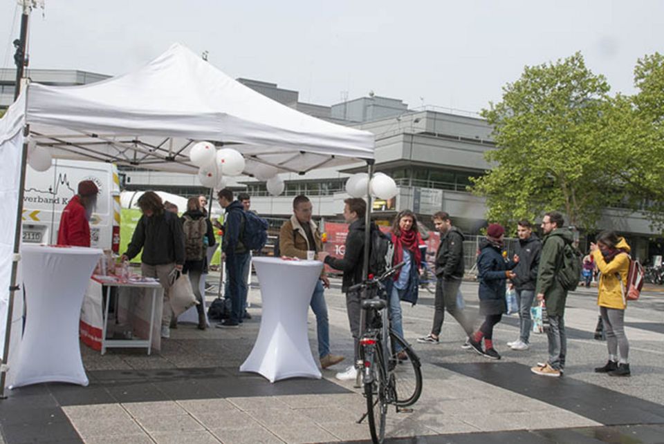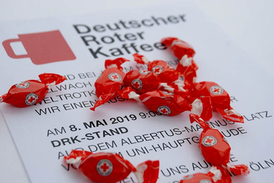 Anlässlich des Weltrotkreuztages am 8. Mai lud das Kölner Rote Kreuz Passanten auf dem Albertus-Magnus-Platz vor dem Uni-Hauptgebäude zum Kaffee ein. Trotz des Schauerwetters gingen über 100 Becher frischgebrühten Kaffees am Aktionsstand über den Tisch. Vor allem Studierende der Universität Köln informierten sich über Engagementmöglichkeiten beim DRK. Helfer und Mitarbeiter vom Kölner Roten Kreuz berichteten von ihrer Arbeit und beantworteten Fragen der Interessenten: von Freiwilligendiensten über die Blutspende bis zu der Rettungshundestaffel.